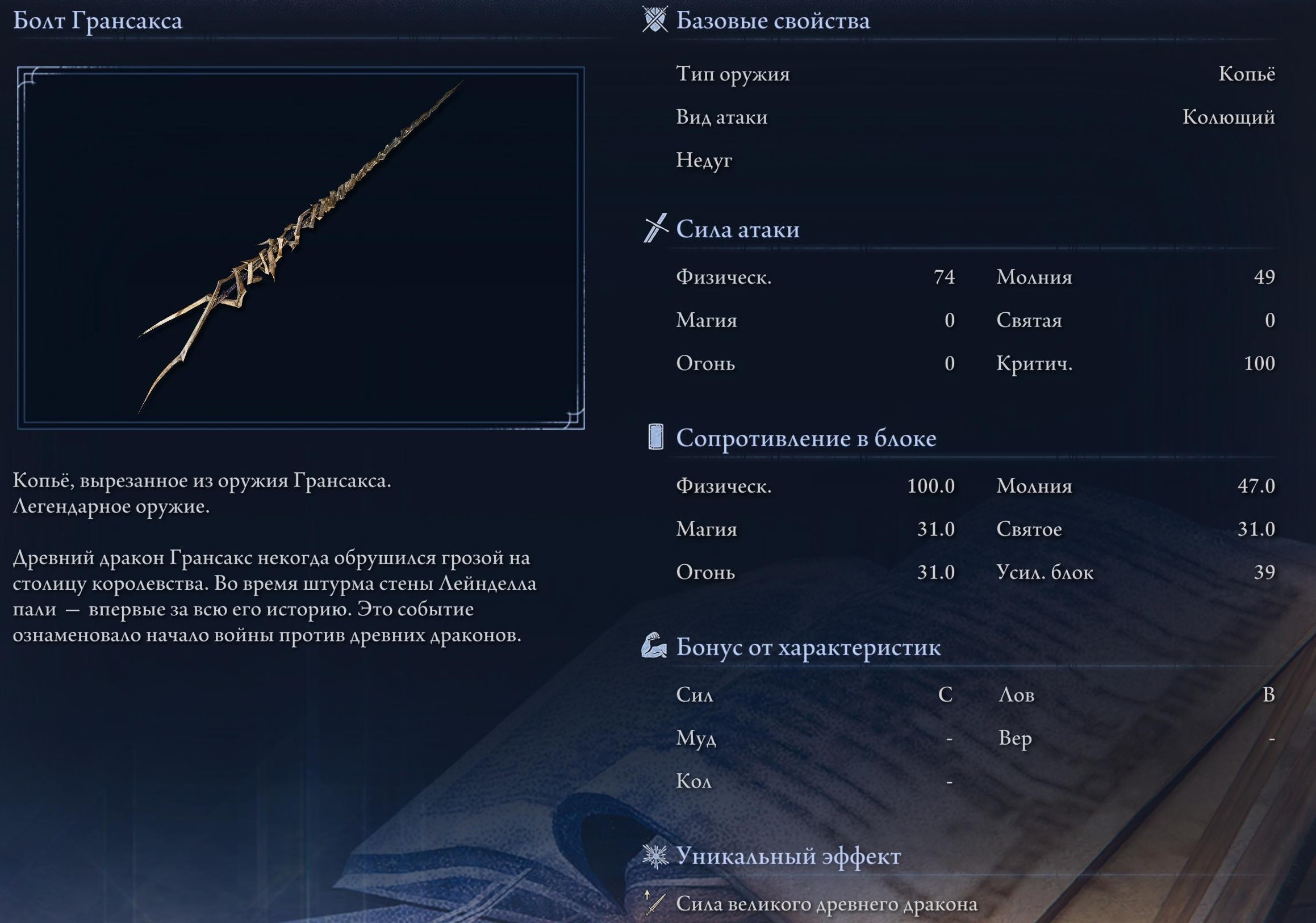 Болт Грансакса (легендарное копье): отличное оружие, которое хорошо скалируется с характеристиками Стража и позволяет держать врагов на расстоянии, атакуя из-за щита. Уникальный эффект: заряженные атаки наносят дополнительный урон молниями.