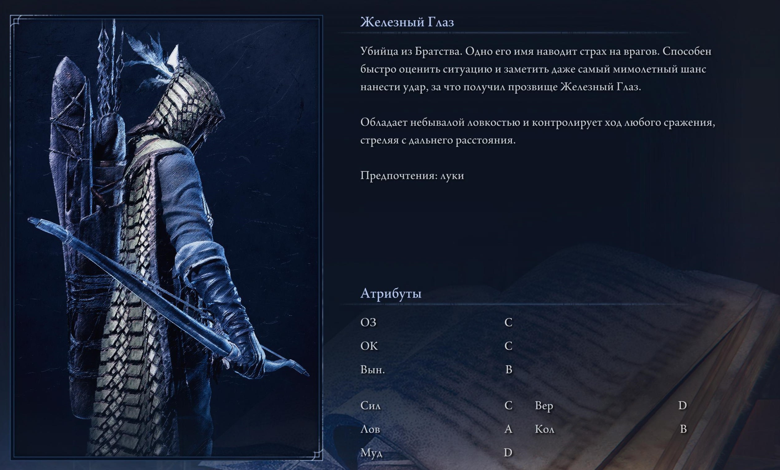 Железный Глаз идеально подходит на роль саппорта: его ультимативная способность оглушает врагов, он способен воскрешать союзников на расстоянии, а также наносить урон с дополнительными эффектами благодаря активному использованию разнообразных смазок и стрел с особыми свойствами. Лучше всего ему подходят луки.