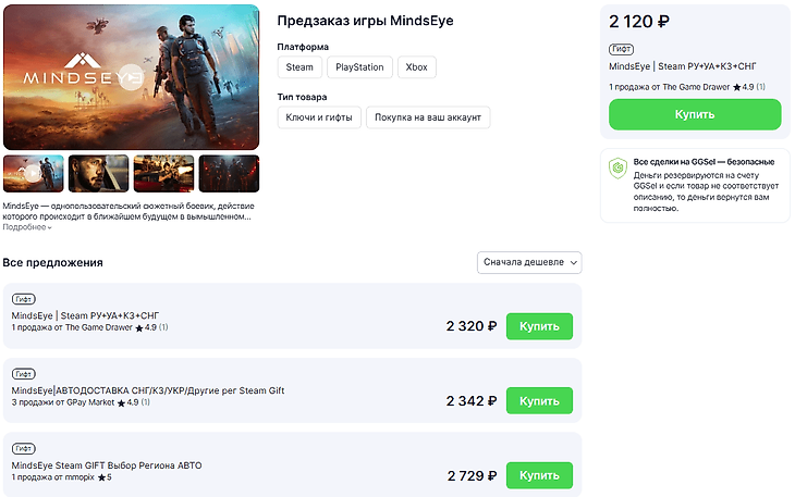 К примеру, на платформе Ggse помимо пополнения баланса можно оперативно приобрести ключ или подарок с MindsEye, что избавит вас от ненужных действий и сэкономит драгоценное время. Выбирая продавца, не забудьте ознакомиться с его рейтингом, отзывами и количеством совершенных сделок – это поможет избежать сложностей при активации.