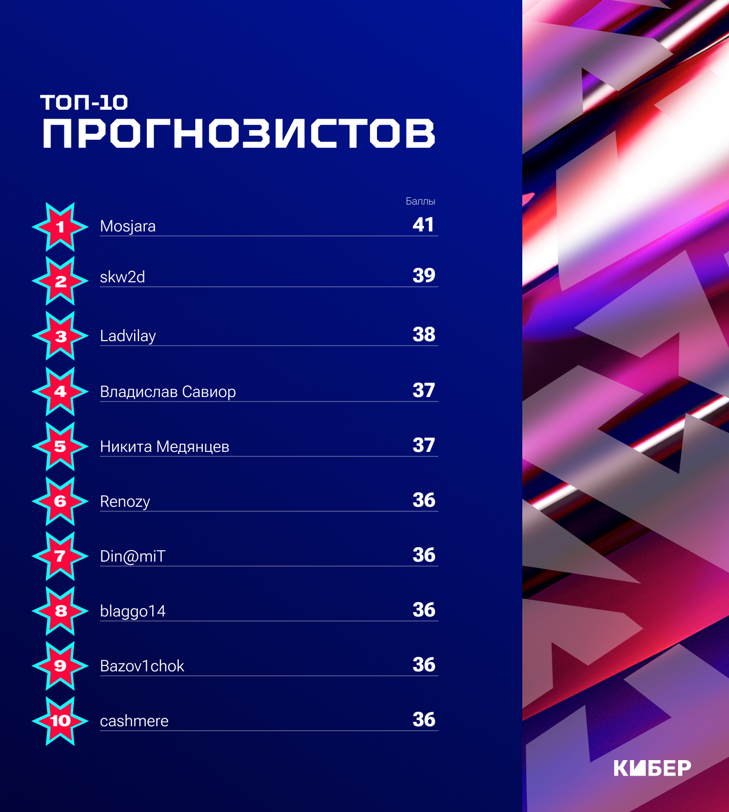 При равенстве очков у двух или более участников выше в рейтинге будет стоять тот, кто угадал больше точных счетов. При равенстве этого показателя выше окажется тот, кто угадает больше исходов сначала в матчах формата bo3, следом — в формате bo1. При равенстве всех показателей выше будет участник, который оставил прогноз на первый игровой день раньше по времени.