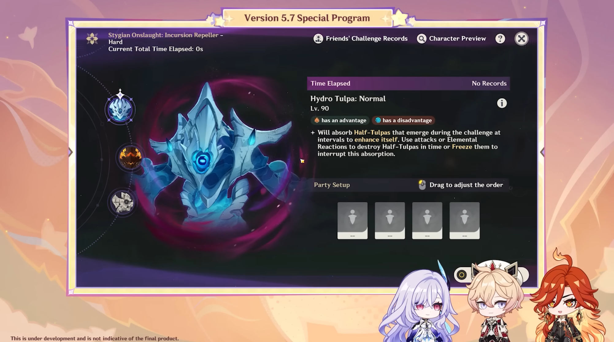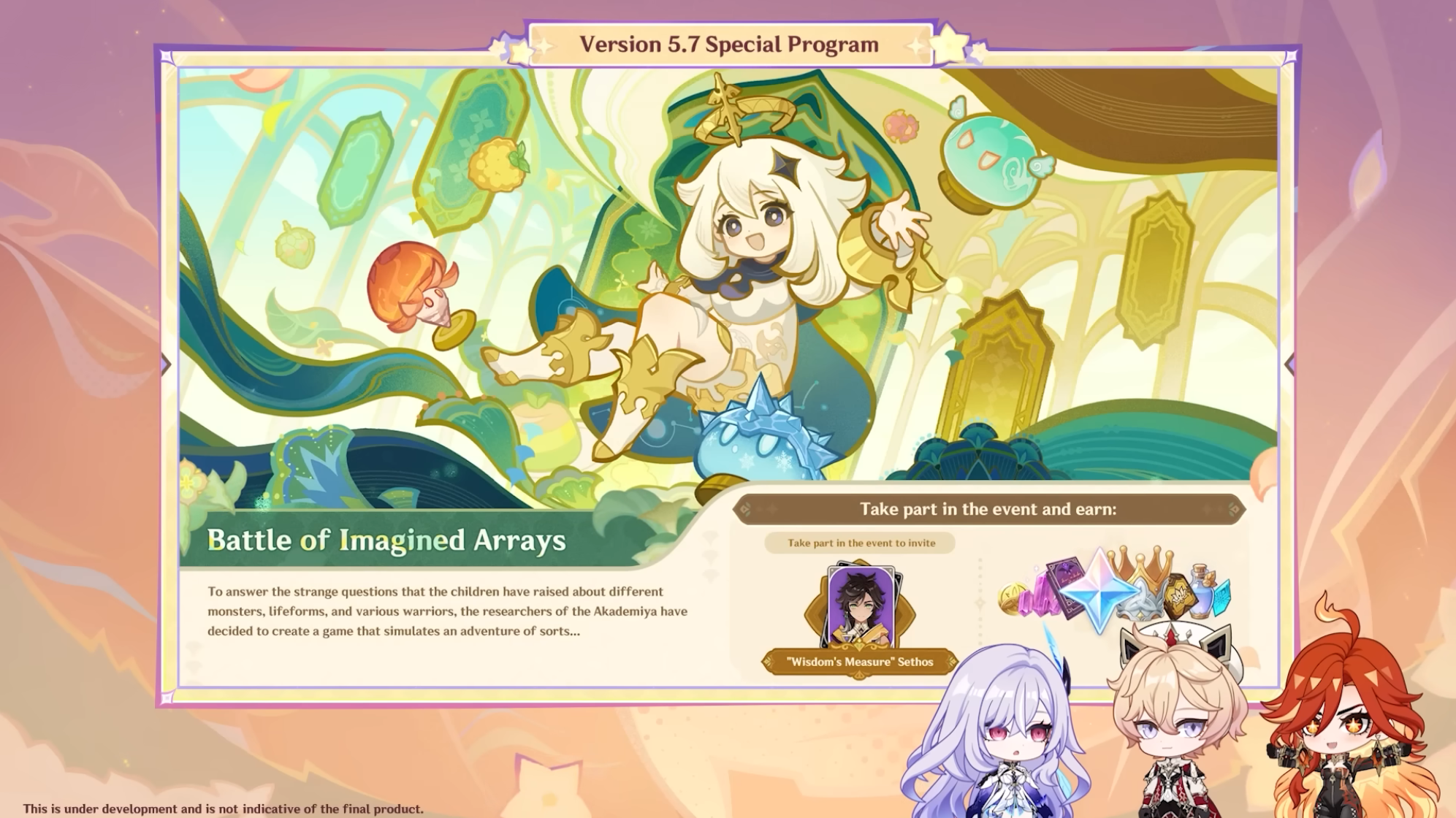 ● «Великая битва размышлений»: в Сумеру ученые Академии создали настольную игру. Путешественники выбирают союзные фигуры, формируют команды и сражаются с противниками в пустыне или тропическом лесу. Улучшайте фигуры, активируйте бонусы за тип фигур и собирайте Монеты приключений для покупки экипировки. Исследовательские этапы с Паймон (сбор фруктов) повышают уровень размышлений и дают усиления. Награда – Камни Истока и бесплатная копия 4⭐ Сетоса.