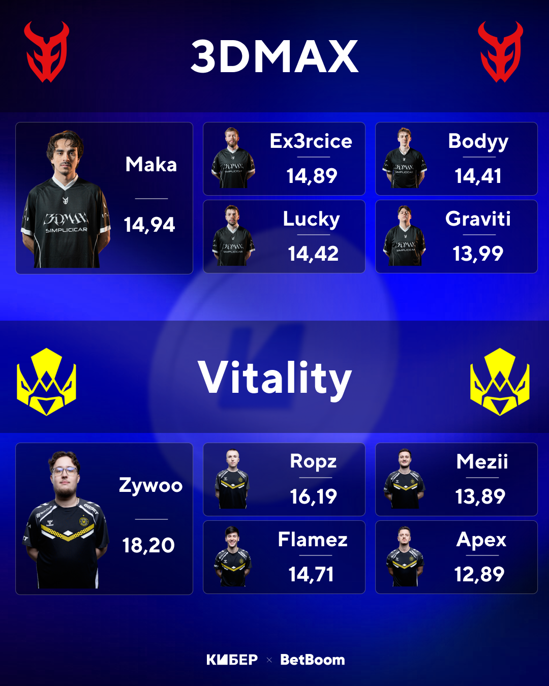 ➢ Zywoo и Ropz заметно выделяются на фоне тиммейтов. Особенно грустно выглядят цифры Mezii – не дотягивает даже до 14 киллов.
