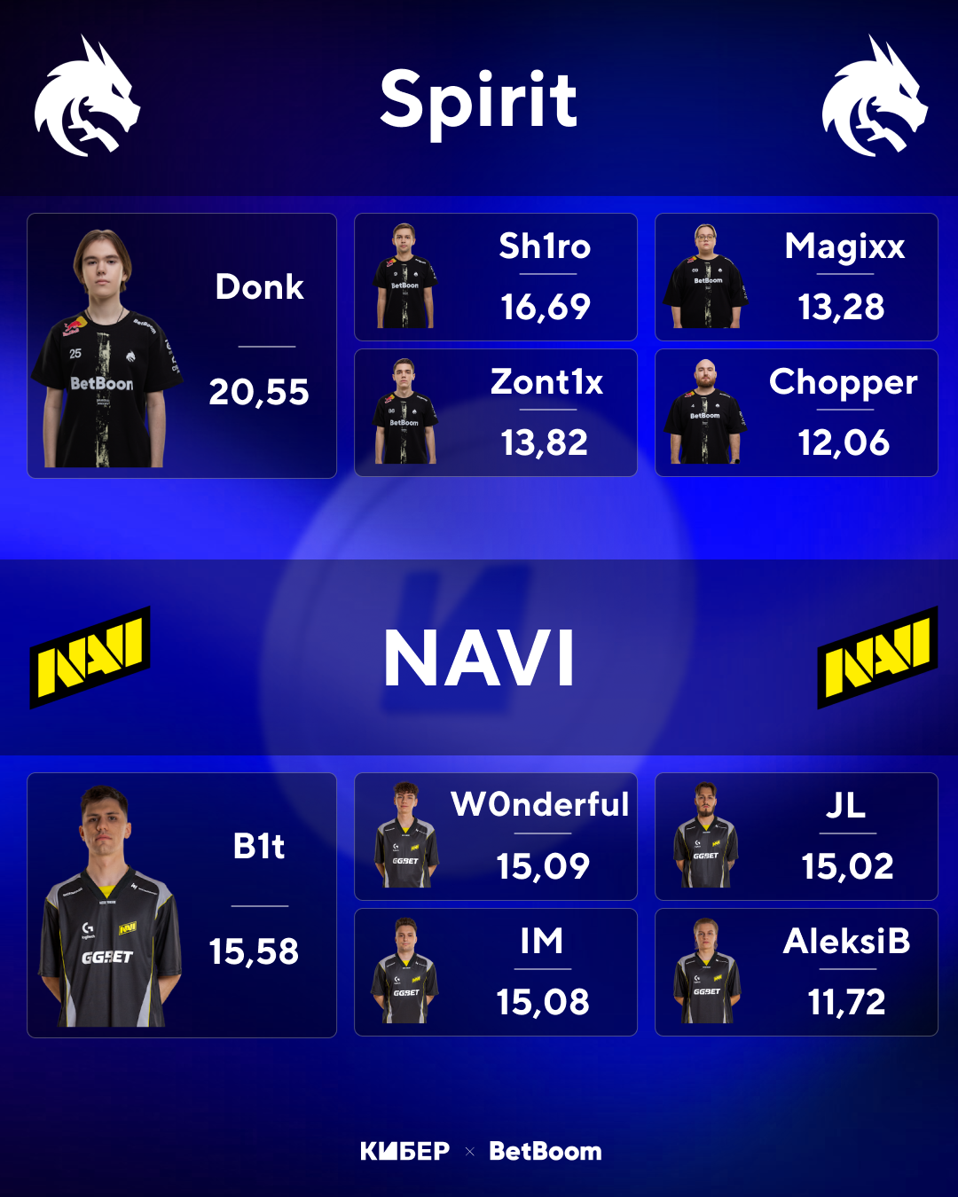 ➢ Donk и Sh1ro сильно выделяются в составе Spirit, остальные ребята сильно скромнее по результатам.