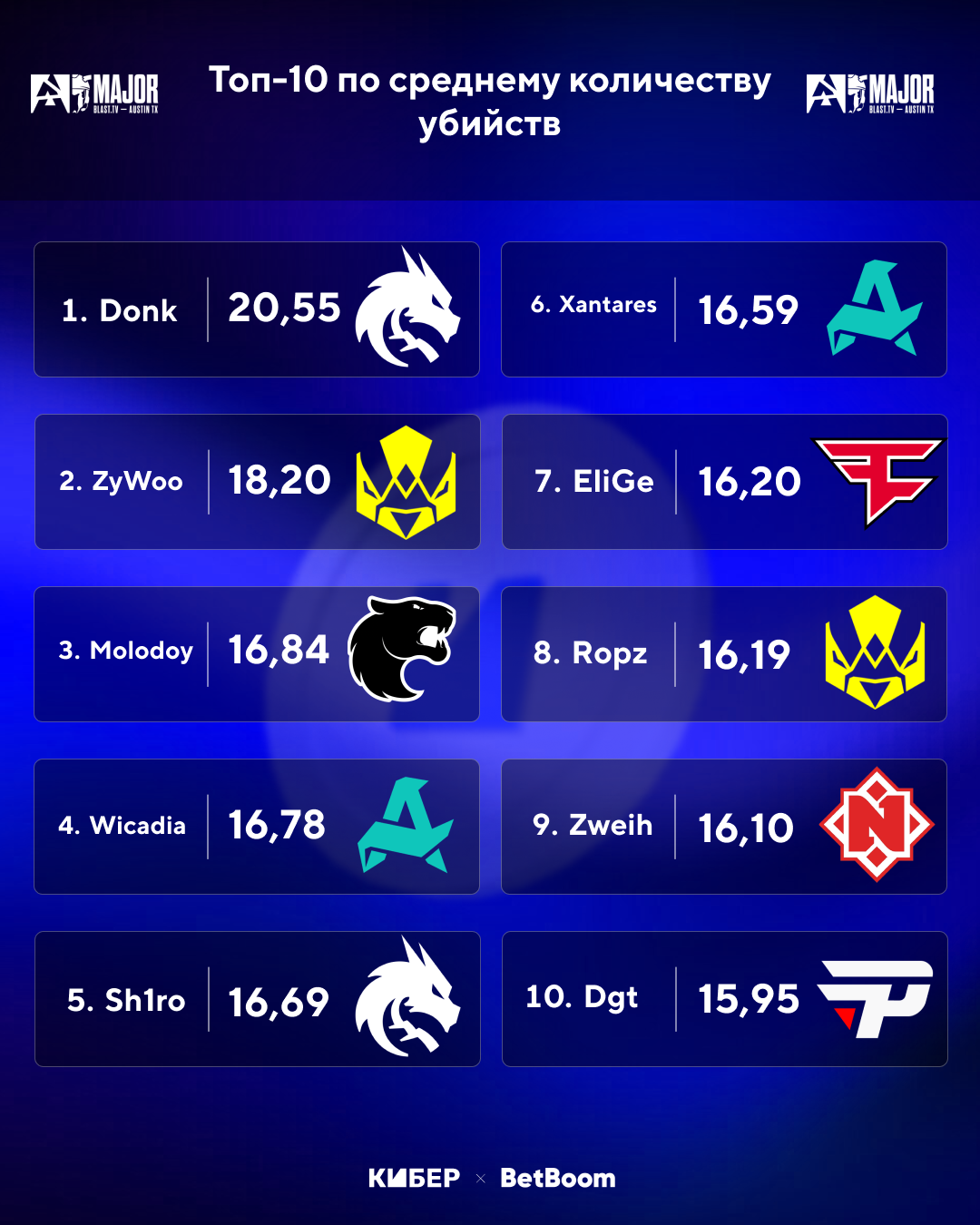BetBoom добавила маркеты на тотал убийств игроков. Мы решили выяснить, кто из участников третьего этапа мейджора в Остине убивает больше противников на карте. Эта статистика точно пригодится при ставках на тотал игроков.