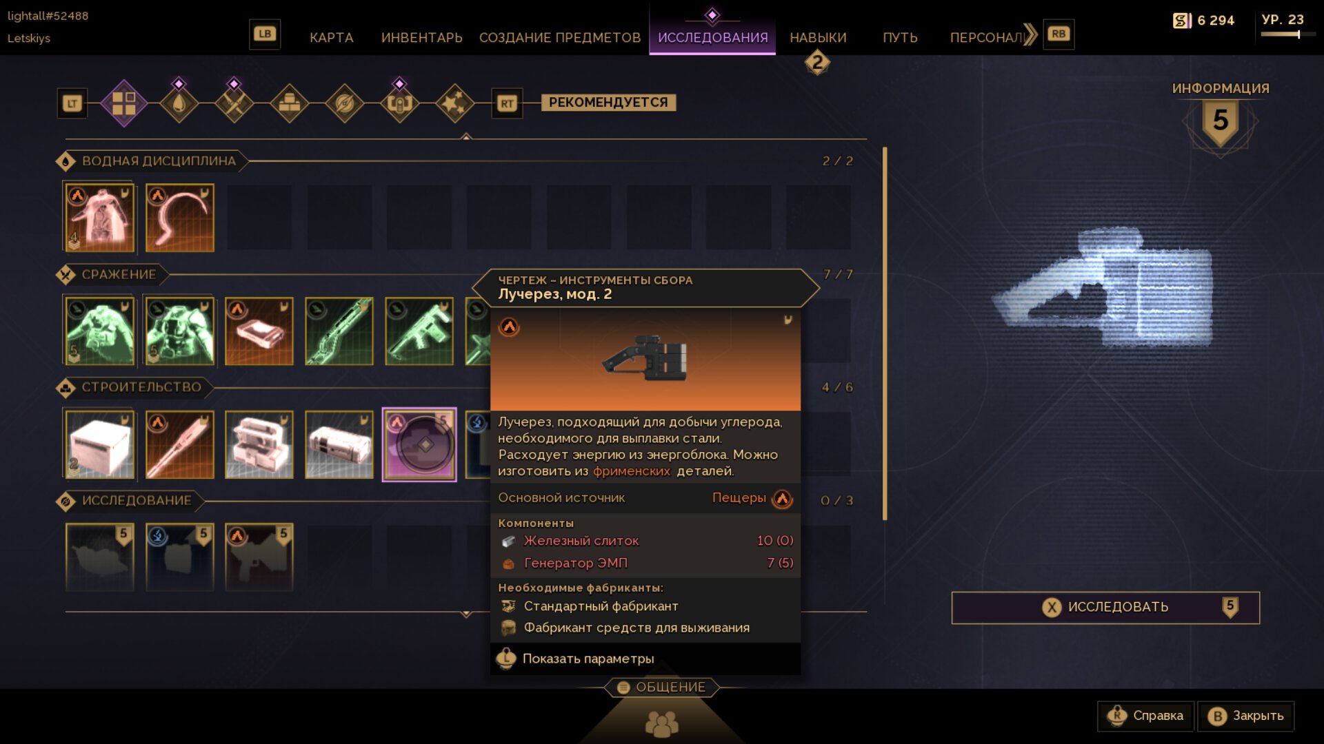 Стартовый лучерез добывает всего два ресурса – гранит и медь. В следующем регионе большие залежи железа, но для его добычи понадобится продвинутый лучерез. Дальнейшие ресурсы вроде алюминия и углерода тоже требуют особый инструмент. Поэтому в древе исследований первым делом открывайте новые лучерезы.