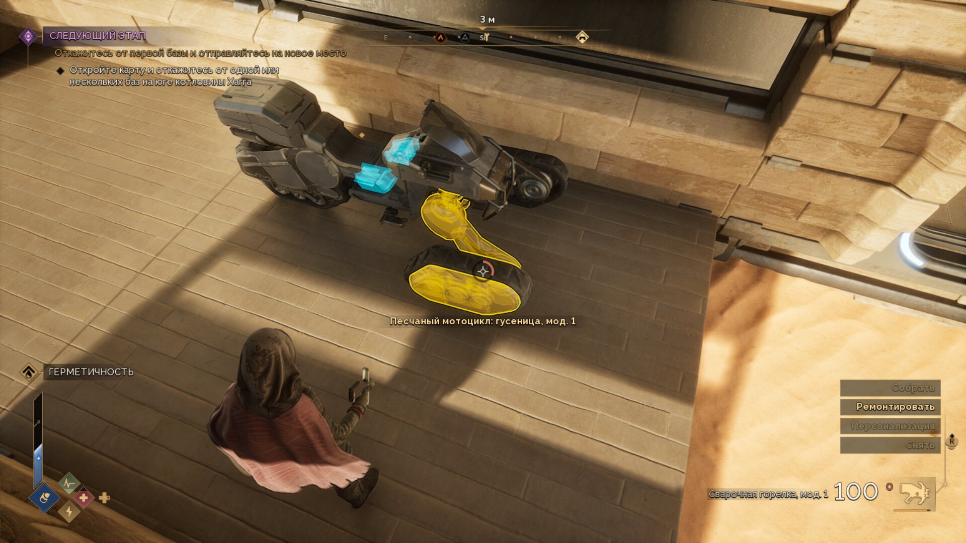 Важно: транспорт ломается из-за выстрелов, падений и, главное, песчаных бурь. Если оставите мотоцикл рядом с домом, буря все равно его уничтожит. Поэтому либо катите транспорт в дом, либо стройте отдельный гараж.
