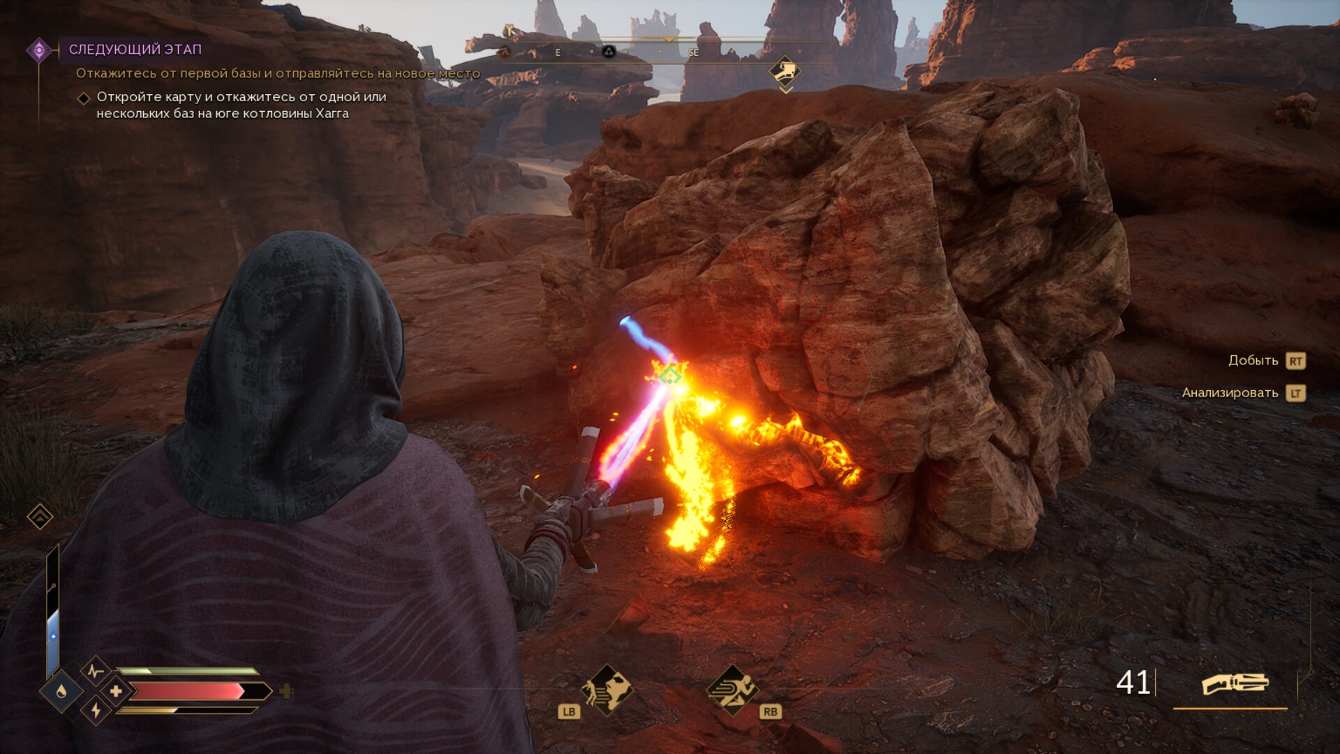 Проблема в том, что новые регионы покрыты туманом войны, и нужная пещера не видна. Чтобы снять туман войны, возьмите зонд-разведчик, снаряженный дроном, заберитесь повыше и выстрелите. Если высота недостаточная, зонд сам подскажет, на сколько метров нужно подняться.