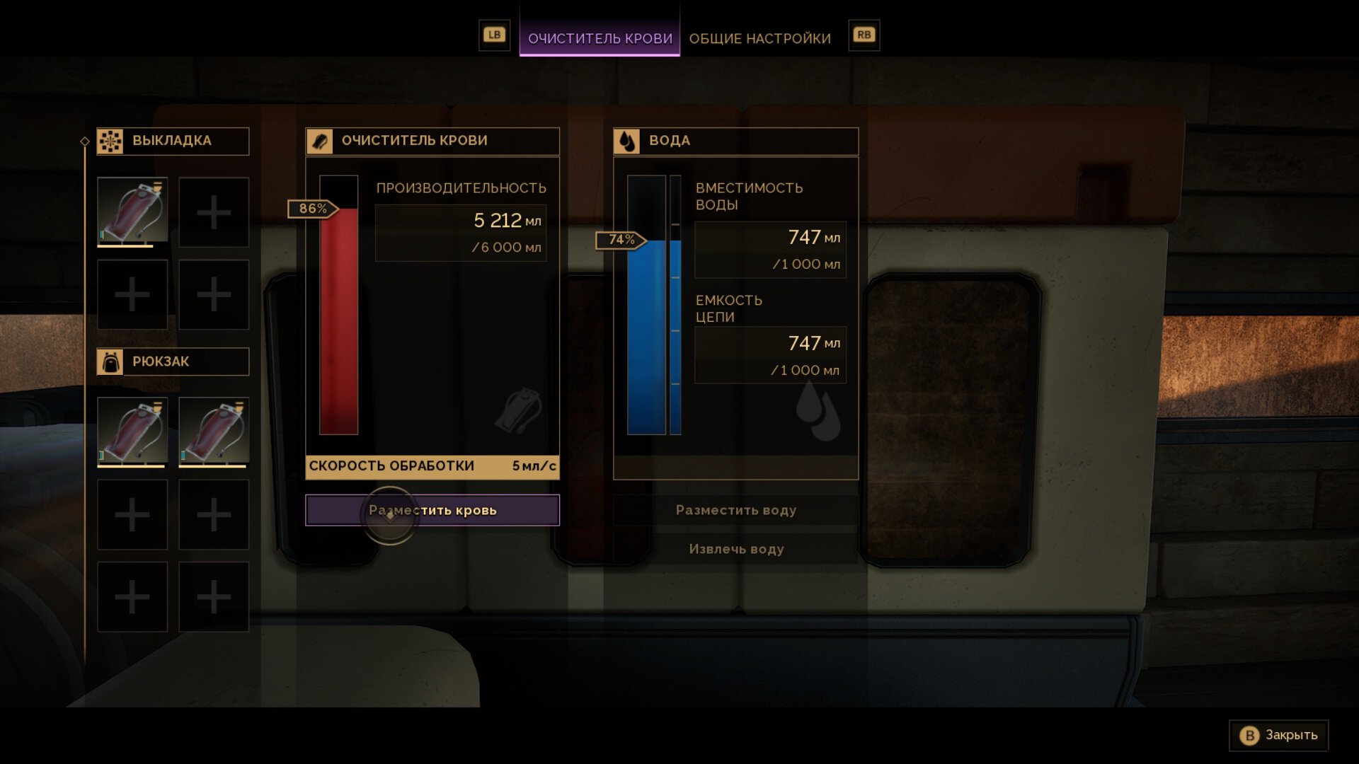 · Кровь из трупов. Убили врага? Достаньте экстрактор и извлеките кровь в гемаконы, пакеты для крови. Изначально из каждого трупа извлекается по литру крови, а в гемаконы вмещаются три литра. Носите хотя бы четыре пакеты и обеспечите базовые потребности.