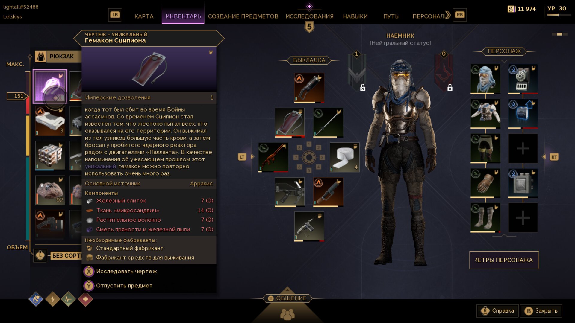 Вы найдете чертежи в исследовательских комплексах, крупных вражеских лагерях или у торговцев. Именно по чертежам вы создадите уникальную экипировку. Но сначала изучите чертеж. К примеру, для легендарного гемакона со скрина на базе нужны стандартный фабрикант и фабрикант средств для выживания.