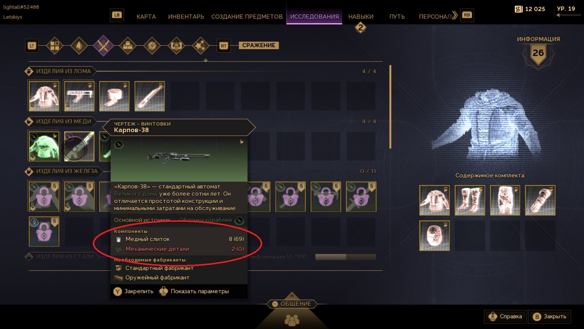 Наведите курсор на недостающий материал, сразу появится заметка о местонахождении. Допустим, для винтовки «Карпов 38» нужны механические детали. Они хранятся на месте крушения кораблей, отмеченных на карте зеленым символом. Бегите туда, перебейте врагов и отыщите в сундуке как минимум две детали. Для крафта понадобится больше материалов, поэтому забег придется повторить.