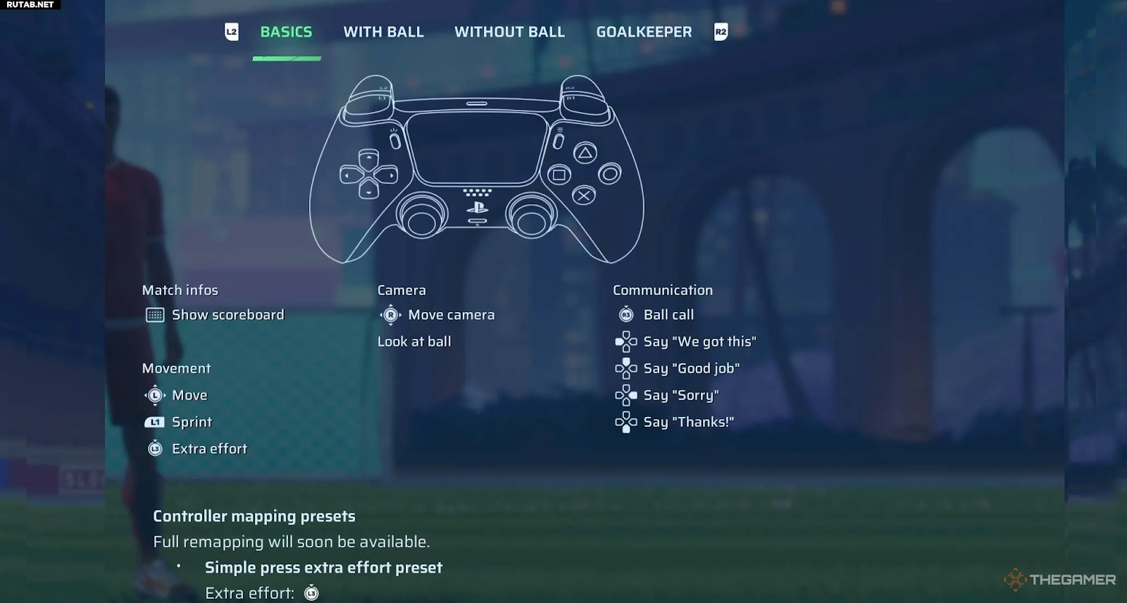 Владельцам PlayStation-геймпада управление схоже, но с небольшими изменениями в расположении кнопок. Основной рывок здесь выполняется клавишей L1, а камера контролируется правым стиком. При контроле мяча удар приходится на кнопку R2, короткие передачи — на квадрат, а дриблинг — на удерживаемый L2. Без мяча игроки используют кнопку круг для отбора и треугольник для подката.