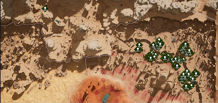 Важно понимать, что добраться до этих точек будет непросто: CHOAM-фабрики охраняются противниками. Плюс рельеф местности сложный, с множеством уступов, склонов и труднопроходимых тоннелей. Если у вас под рукой окажется багги, передвигаться по этой местности будет гораздо проще.