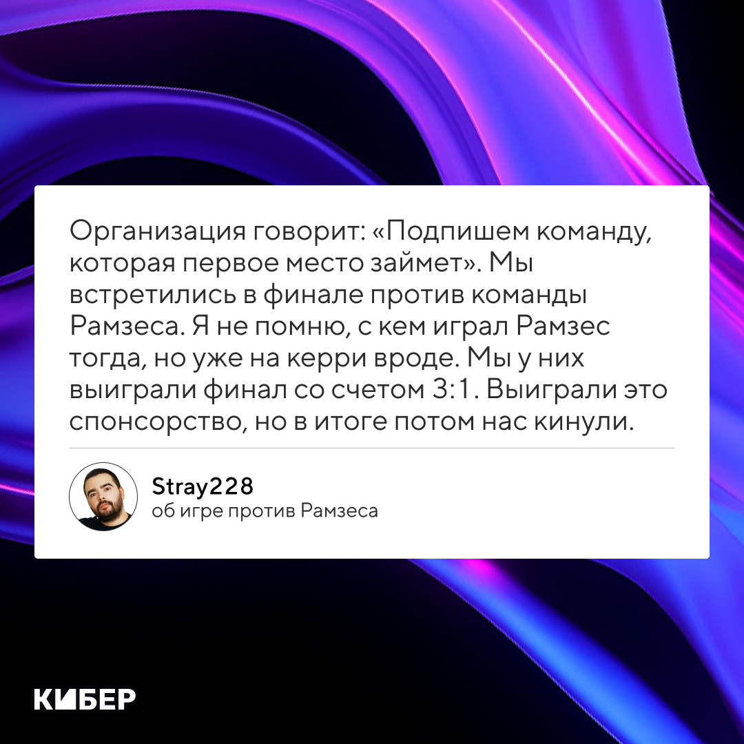 И организация говорит: «Подпишем команду, которая первое место займет». Мы встретились в финале, моя команда против команды Рамзеса. Я не помню, с кем играл Рамзес тогда, но он играл уже на керри вроде бы. Мы у них выиграли финал со счетом 3:1. Выиграли это спонсорство, но в итоге потом нас кинули. Такая вот история.