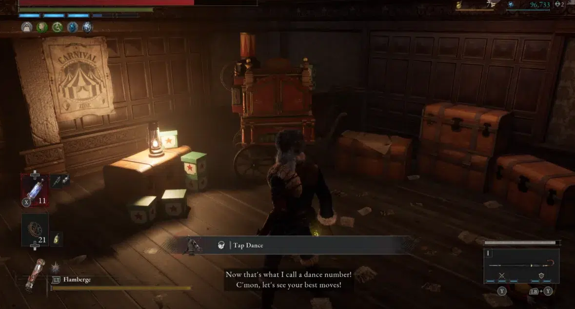Монету можно найти вскоре после достижения статуи Звездочета в «Карнавальном саду». Пройдя через главные ворота и повернув налево, возле высокой колонны игрок обнаружит куклу в бело-голубом наряде. Взаимодействие с ней подарит первую карнавальную монету. Использовать ее стоит в ближайшем желтом доме, где вставка монеты в механизм запустит кукольное представление и откроет жест «Чечетка».