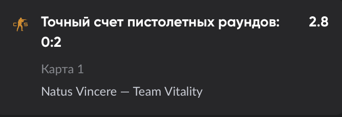 Точный счет пистолетных раундов на карте. 1-й и 13-й раунды на каждой карте – пистолетные. Можно поставить на исход этих раундов. Всего три варианта исхода: 1-1 или 2-0 в пользу одной из команд.