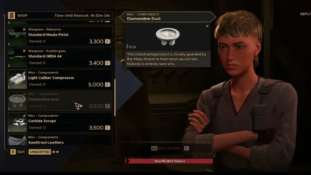 - Оружейные торговцы: В этих городах оружейные торговцы часто продают редкие компоненты, включая диамантиновую пыль. Однако цена может быть довольно высокой (например, 3500 Соляри за единицу), а для доступа к некоторым товарам может потребоваться определенный уровень репутации с фракцией (например, 4-й уровень).