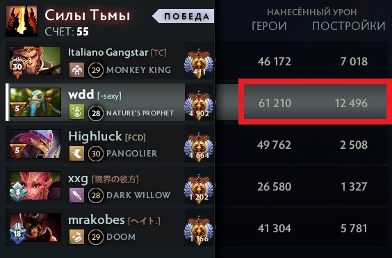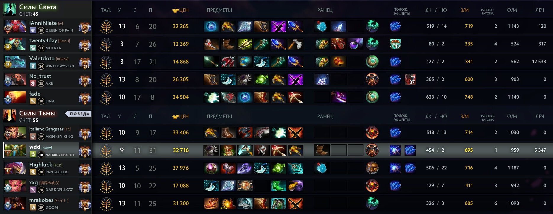 Недавно я сыграл матч со средним рейтингом 10 309 MMR. И вот такой у меня получился Фурион-пятерка: