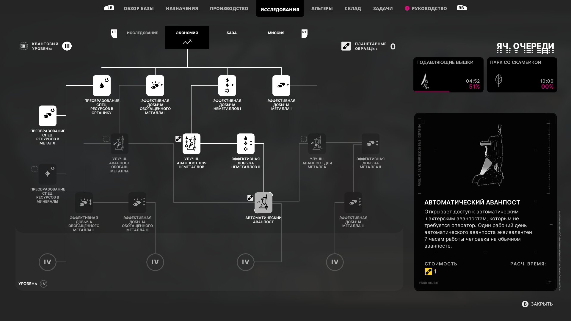 • Автоматические аванпосты. На локации из второго акта доступны по две жилы каждого ресурса. Чтобы все работали, попросту не хватит людей. Вот почему автоматические аванпосты важны. Изначально они работают по семь часов и приносят меньше добычи, но после прокачки ничем не уступают человеку.