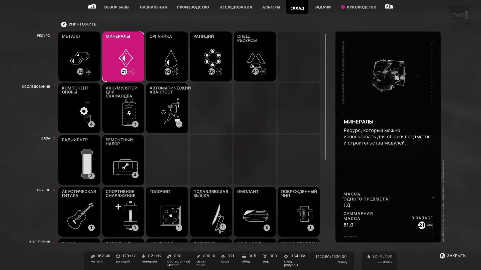 • Завершите создание всех предметов. Если заглянете на склад, увидите: там отмечены свободные ресурсы и те, что уже выделены на крафт обедов, расходников и прочего. Сам предмет обычно весит меньше, чем необходимый на его создание материал.