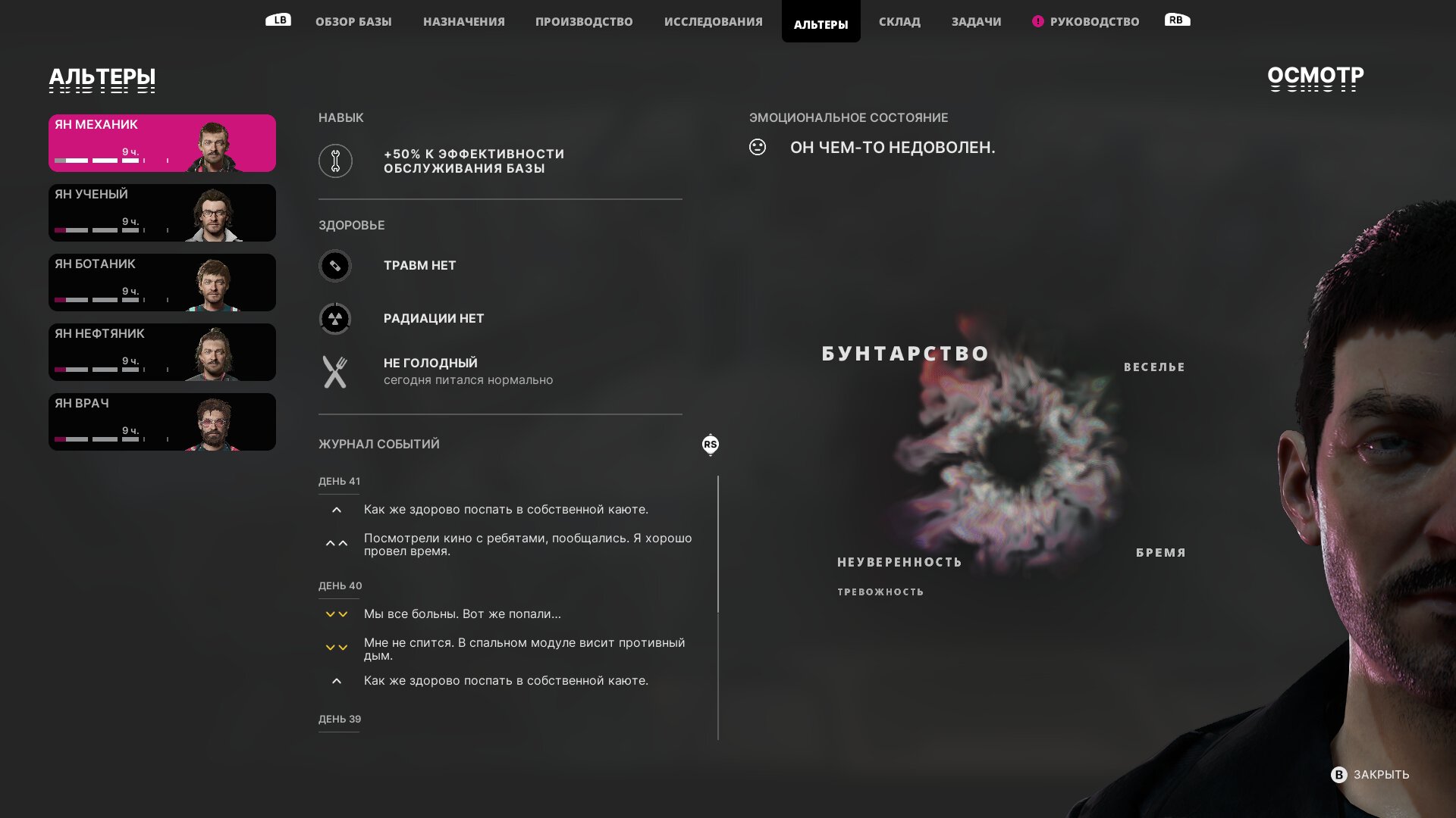 • Ян Доктор. На вылазках вы с напарниками неизбежно облучитесь. Назначьте доктора в лазарет, и он вылечит болезнь в восемь раз быстрее. Также доктор отменно готовит и разблокирует новое блюдо «Пир».