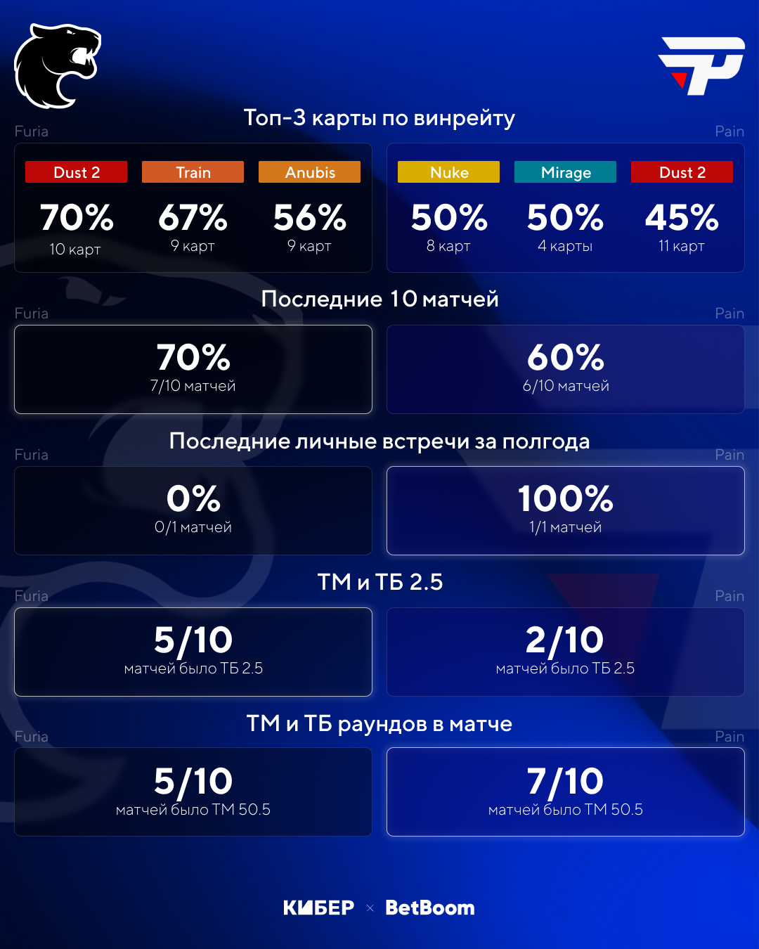 Аналитики и пользователи BetBoom верят в победу Furia, 94% пользователей поставили на коэффициент 1,45. Furia действительно выглядит сильнее, но Pain уже показала, что способна навязать борьбу команде Фоллена. Предлагаем поставить на тотал карт больше (2,5) с коэффициентом 1,95.