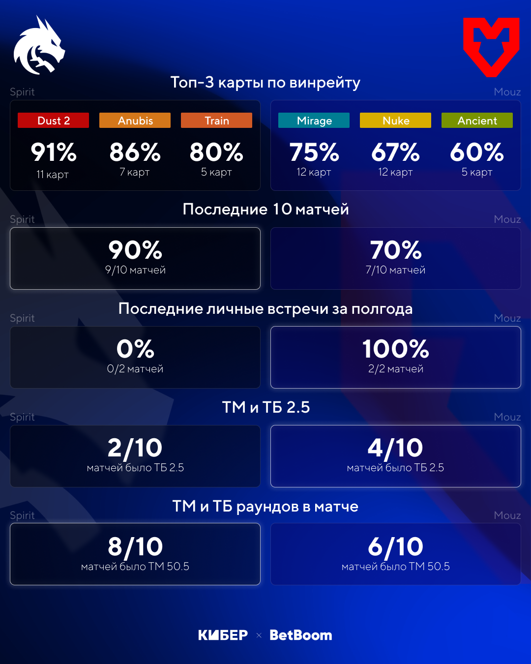Mouz показала слабую игру на мейджоре, поэтому мы тоже верим в успех Spirit. Учитывая разницу в качестве игры, предлагаем поставить на фору Spirit по картам (-1,5). BetBoom дает коэффициент 2,35 на это событие.
