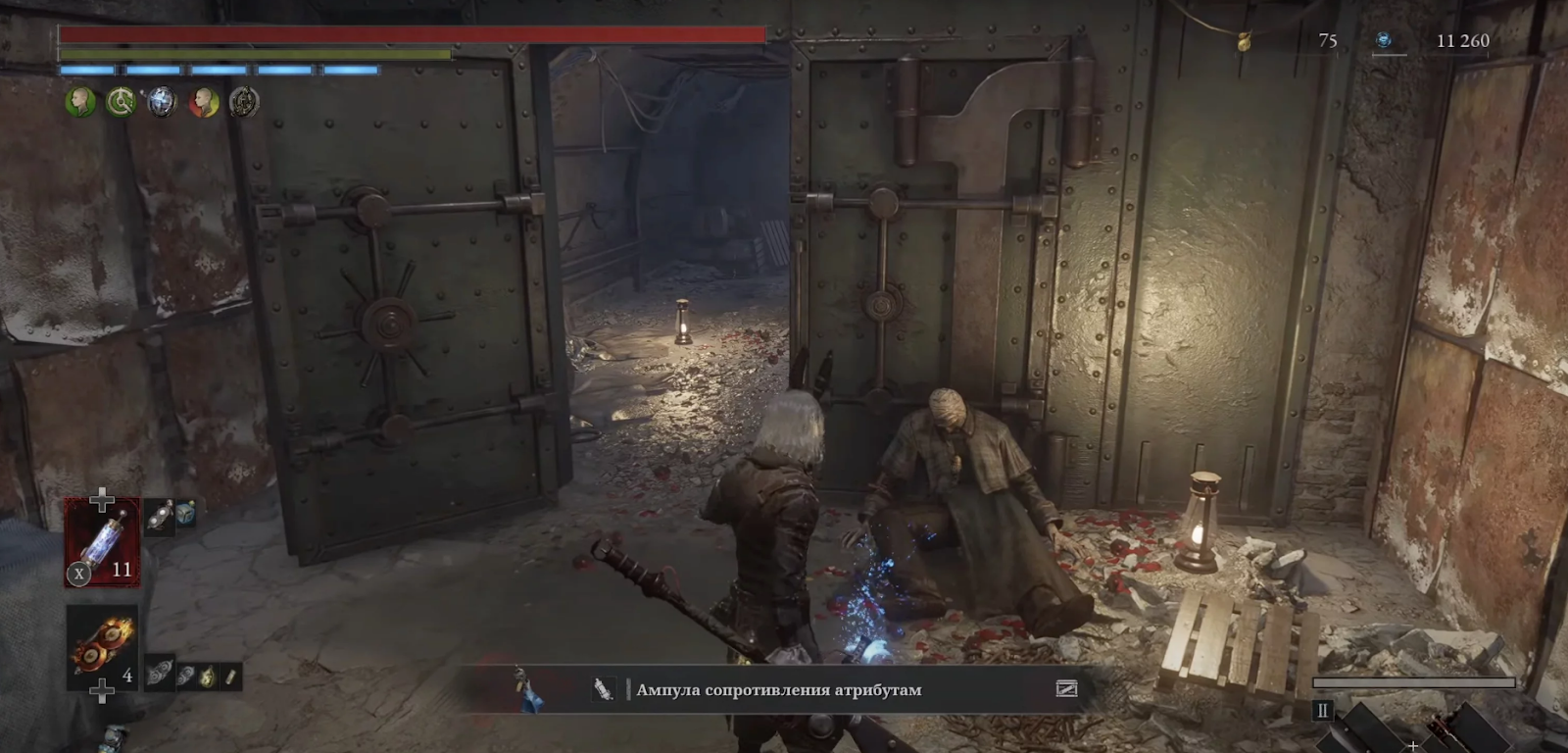 Сразу после спуска на лифте не стоит упускать шанс открыть ящик с амулетом железной стены +1, который значительно повысит защиту героя. В коридорах подземелья внимание привлекает ампула сопротивления атрибутам, а также главный ключ семьи Монад, необходимый для открытия новых областей.