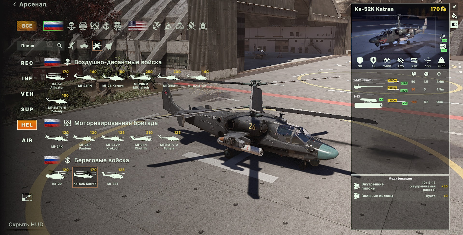 - Ка-52 «Аллигатор» (Воздушно-десантные войска) / Ка-52К «Катран» (Береговые войска): Оба вертолета стоят одинаково и являются самыми быстрыми в российском арсенале. «Катран» хорош против бронированной техники, а «Аллигатор» может дольше находиться в бою. Выбирай того, кто больше подходит под твою стратегию, но «Аллигатор» чаще всего справляется со всеми задачами на ура.