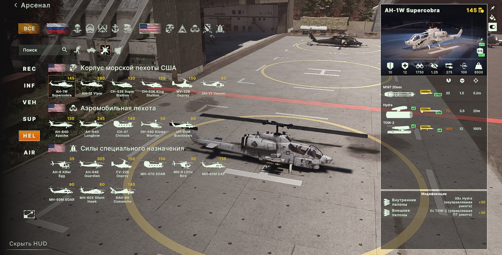 - AH-1W Supercobra (Корпус морской пехоты США): Выполняет ту же роль, что и более дорогие Viper и Longbow, но стоит гораздо меньше. Supercobra чуть быстрее Longbow, что компенсирует его менее мощное вооружение. Большинство угроз он способен справиться сам.