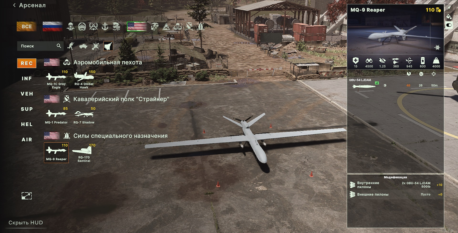 - MQ-9 Reaper (Силы специального назначения) / MQ-1C Gray Eagle (Аэромобильная пехота): Идеальное дополнение к снайперам. Дроны настолько эффективны, что ты можешь построить вокруг них всю стратегию. Reaper быстрее и наносит чистый разрушительный урон, а Gray Eagle медленнее, но с четырьмя ракетами и высокой бронебойностью бесценен против тяжелобронированных целей. Оба стоят 110 очков и прекрасно справляются с ролью воздушных «хищников».