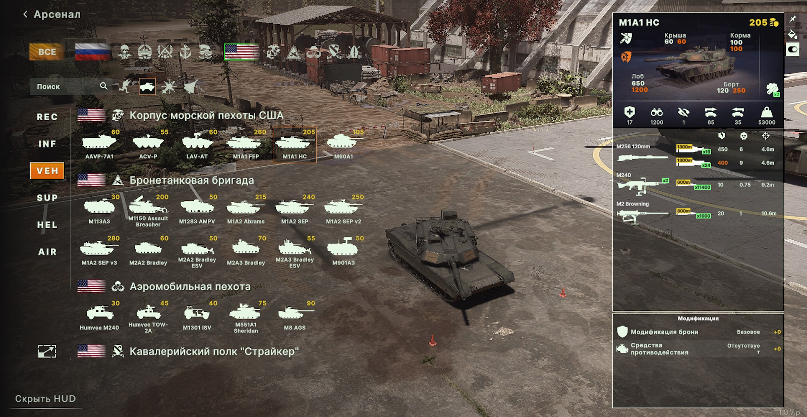 - M1A1 HC (Корпус морской пехоты США): Один из лучших вариантов танков M1A по соотношению цена/эффективность. За 205 очков это один из самых доступных тяжелых танков, лишь немного уступающий по броне более дорогим модификациям. Если нужна усиленная бронебойность, всегда есть M1A2, но они дороже.