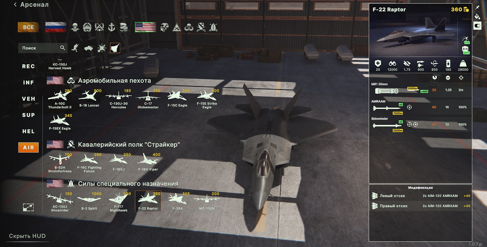 - F-22 Raptor (Силы специального назначения): У Raptor небольшой запас топлива, но пока он в воздухе, он превращает вражескую авиацию в обломки. Его скорость (900!) и скрытность означают, что противник просто не успевает среагировать. Raptor легко сбивает вертолеты и самолеты, а при случае может сделать штурмовой налет с пулеметом.