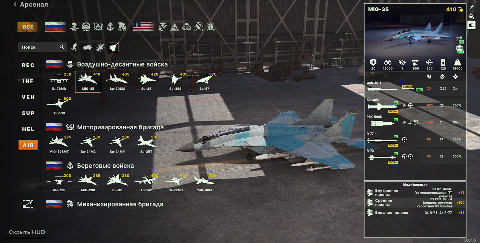 - МиГ-35 (Воздушно-десантные войска): Этот легендарный истребитель – молниеносен и смертоносен для любой наземной цели. Но такая эффективность имеет свою цену: он очень дорогой (более 400 очков!) и у него небольшой запас топлива. Тактика проста: влетел, уничтожил, улетел. Классический «бей-беги».