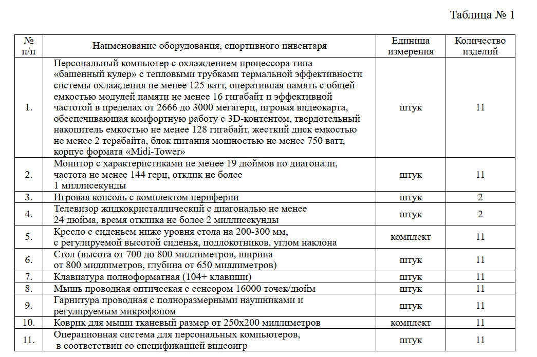 Просто так стать киберспортсменом не получится – обязательно нужен инвентарь, причем вполне конкретный. Перед вами требования для места, где молодой кибератлет будет тренироваться. На какое количество людей рассчитаны 11 компьютеров, 2 консоли и 2 телевизора, не уточняется: