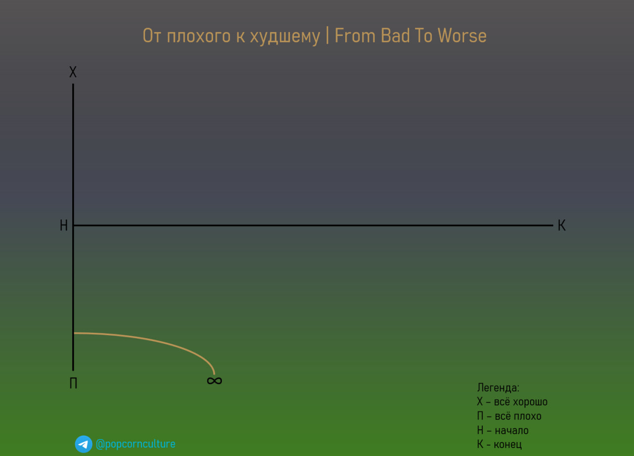 🔴Структура: Герой попадает в ловушку или катится в бездну, у которой нет конца. Любое улучшение иллюзорно, оно не ведёт ни к чему хорошему. Попытки что-то изменить тоже ведут в никуда. Финал оставляет лишь ощущение безысходности.