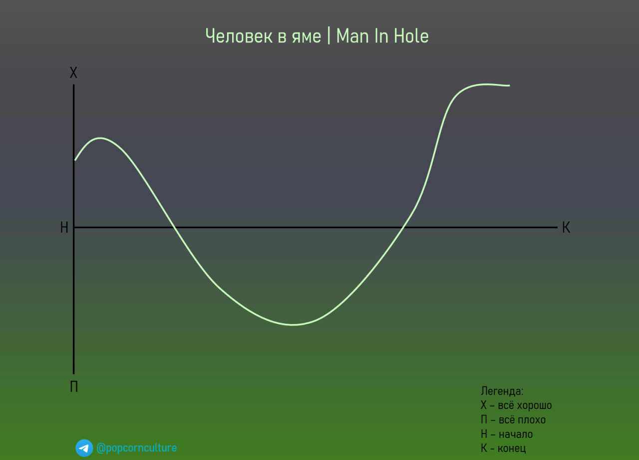 🔴Структура: История начинается с позитивных событий. У героя всё благополучно, но неожиданно он сталкивается с испытанием или попадает в неприятности. Однако благодаря своим качествам или чьей-то помощи он преодолевает трудности и приходит к финалу другим — независимо от его итога (это не всегда хэппи-энд).