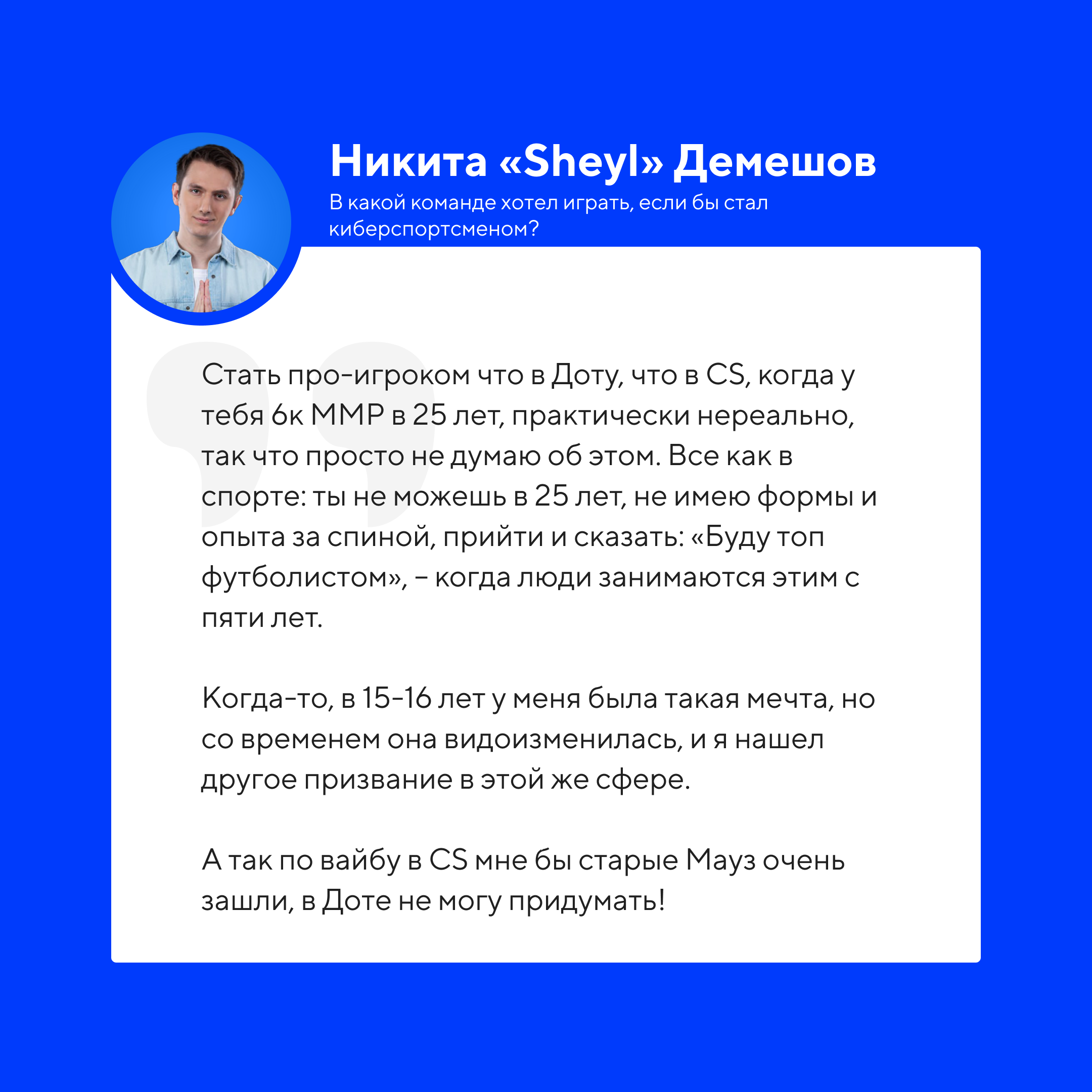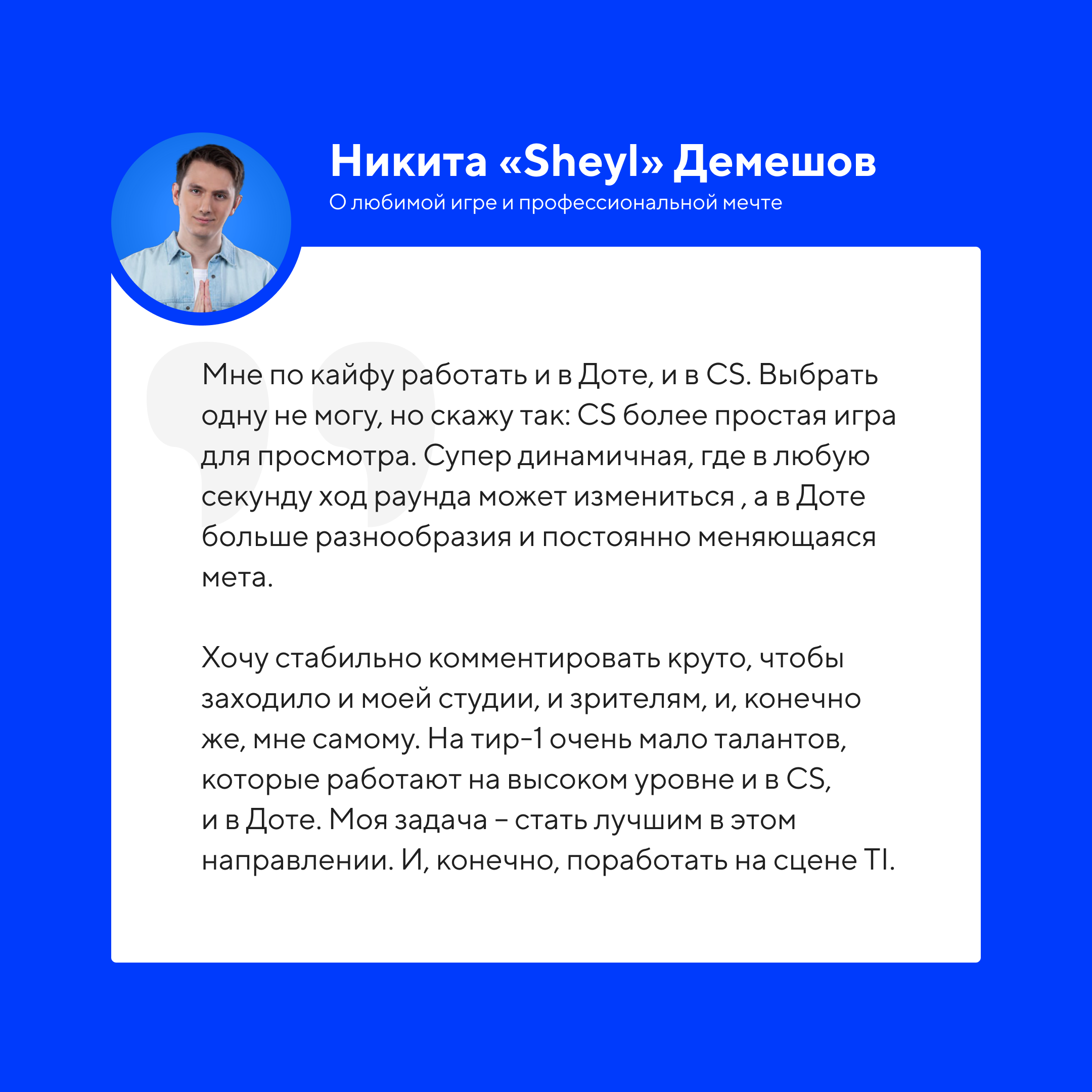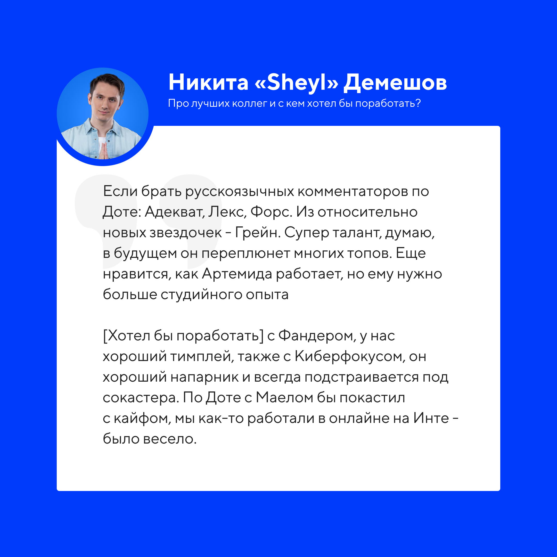 В честь старта Esports World Cup 2025, который показывает студия FISSURE, Кибер позвал в гости аналитика и комментатора Никиту «Sheyl» Демешова. Он ответил на ваши вопросы из комментариев, а мы выбрали самое главное.