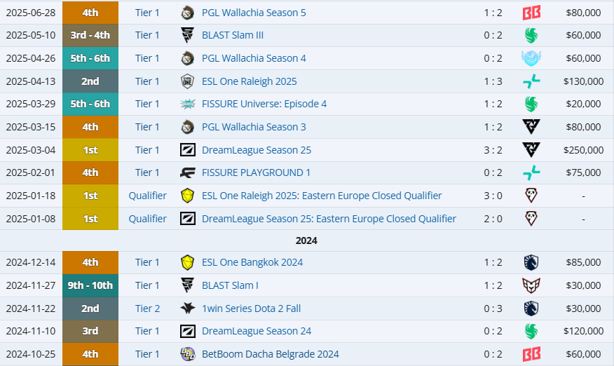 Результаты за 2024-2025 год очень хорошие. Лишь один раз команда закончила турнир ниже топ-6. А так 9 раз в топ-4, три финала и победа на Дримлиге.