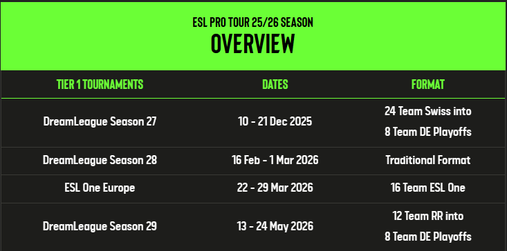 Каждый сезон EPT будет состоять из трех DreamLeague и одного обновленного ESL One. Каждая DreamLeague будет иметь свой собственный формат, чтобы разнообразить календарь и сделать наши события по Dota интересными для всех.