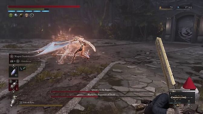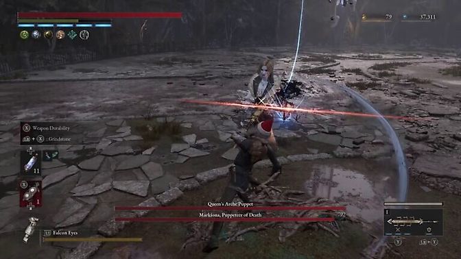 Марионетка способна имитировать подготовку к мощному удару, замедляясь, что означает момент для уклонения или парирования. В этом бою полезно использовать метательные предметы, которые дают возможность безопасно снижать здоровье врагов, когда подходить слишком рискованно.