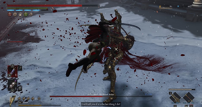 Комбинации Арлекино здесь более быстрые и длительные, что предъявляет повышенные требования к скорости реакции и выносливости. Не забывайте использовать ближнего союзника Леа Флоренс – ее помощь существенно облегчает бой, позволяя наносить критические удары и безопасно отступать.