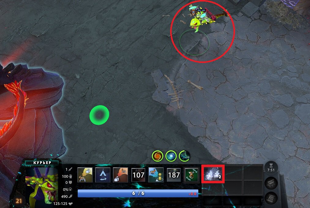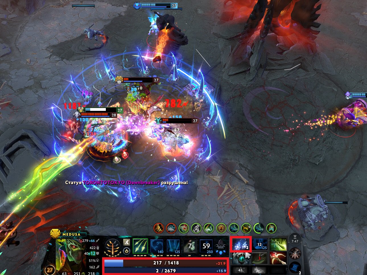 Алан в критической ситуации с 217 здоровья и практически без маны мгновенно перекладывает Power Treads и сразу же съедает один цветок. А после перезарядки в 5 секунд – второй. Как же на тоненького!