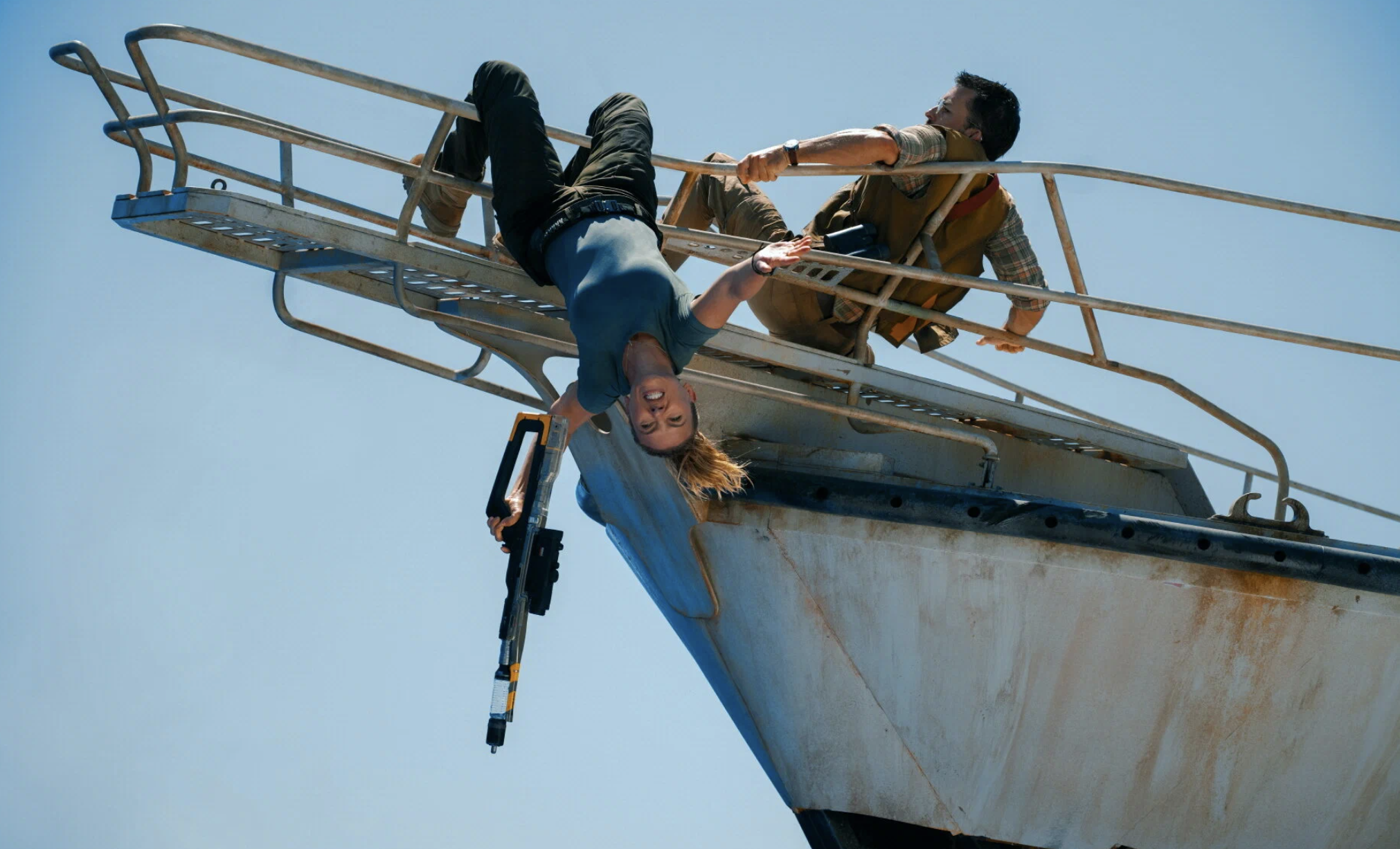 В историю в первые полчаса вклинится еще одна группа людей – экипаж гражданской лодки, которая потерпела крушение при встрече с динозаврами. В ней: папа, его две дочери (постарше и помладше), а также ленивый бойфренд старшенькой, который не любит нести вахту и постоянно спит в каюте. Изначально они кажутся обузой как для основного отряда, так и для сюжета фильма, но ближе к экватору картины за их приключениями становится следить даже интереснее, чем за бойцами и учеными.