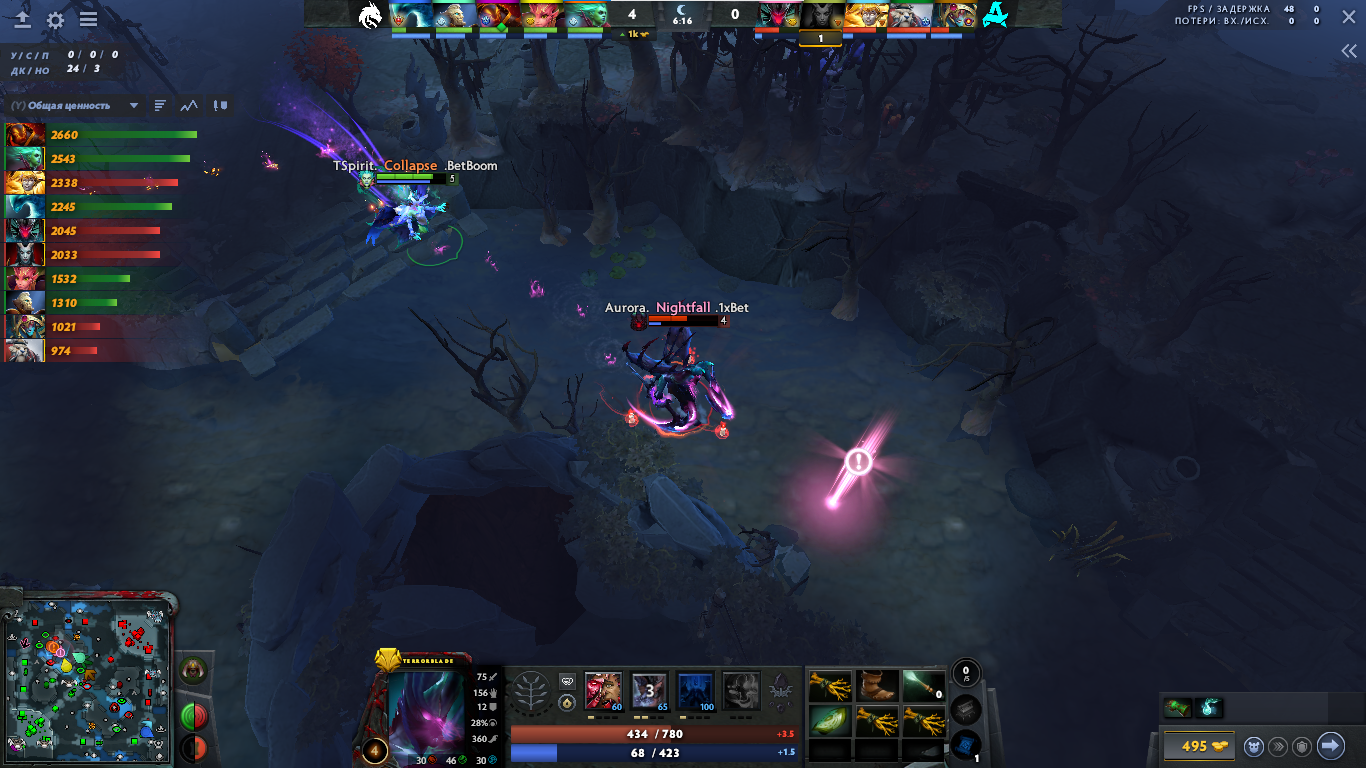 Просто посмотрите, как Nightfall на 6 минуте в панике убегает от соло-Баньши, потеряв половину здоровья с одного сифона. Спойлер – это его не спасет, и после драки он будет отставать от Death Prophet по золоту уже в полтора раза.