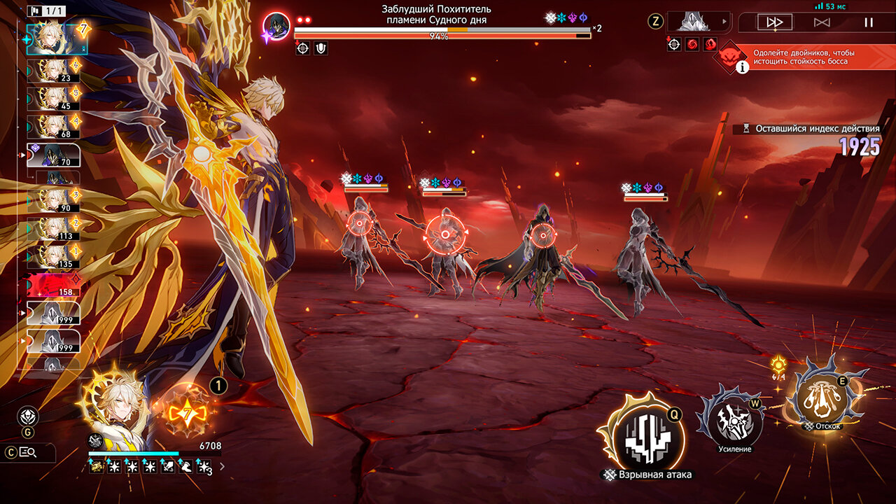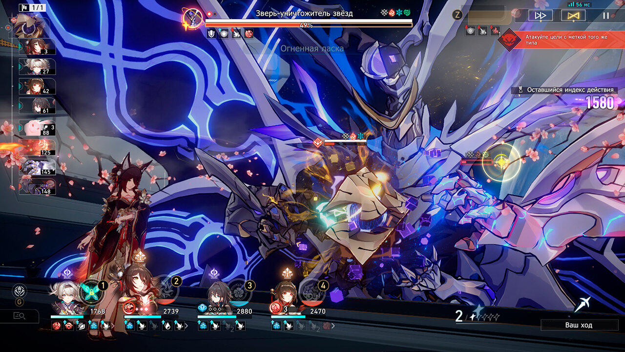 Зверь-уничтожитель обладает физической, огненной, ледяной и ветряной уязвимостями. В бою он умеет накладывать квантовую и мнимую уязвимость на вашу команду – и если не снять ее, то он наложит метку снова, и сработает Связывание или Заключение на ваших героях. Чтобы снять ее, бейте по врагу с соответствующей меткой.