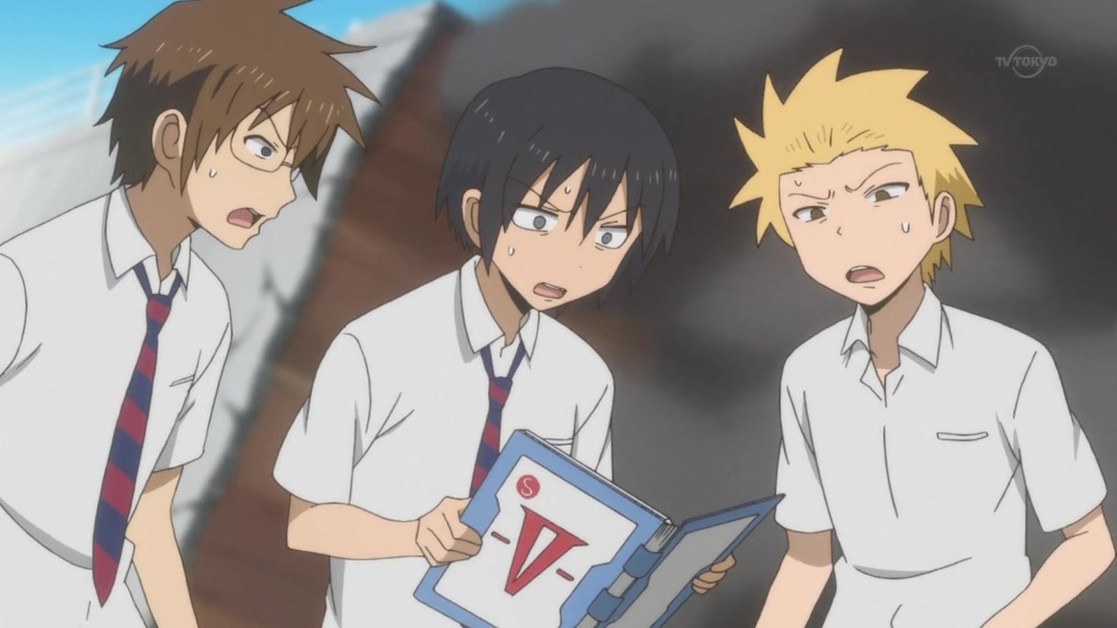 Это комедийное аниме 2012 года, созданное студией Sunrise по манге Ясунобу Ямаути, где каждая серия состоит из коротких зарисовок о жизни старшеклассников. Основное внимание уделяется трем друзьям – Тадакуни, Хидэнори и Еситакэ, а также их одноклассникам, родственникам и абсурдным ситуациям, в которые они попадают. Тадакуни – самый нормальный из троицы, часто втягивается в безумные идеи друзей. Хидэнори – тихий и странный, любит неожиданные выходки. Еситаке – веселый и энергичный, мастер абсурдных предложений. Вместе они разыгрывают драматичные сцены из боевиков, но в реальной жизни. Например, воображают, что идут на войну, а на деле просто идут в школу. Ребята придумывают глупые игры (на подобие: «кто первый моргнет – тот и проиграл»). И сталкиваются с неловкими ситуациями, например, когда пытаются познакомиться с девушками, но все идет не по плану. Парни устраивают интеллектуальные поединки, но всё сводится к детским спорам. Они пытаются представить, как бы они вели себя в романтическом аниме, но в реальности выходит смешно и нелепо. Придумывают страшилки про учителей, которые оказываются полной чепухой. Герои понимают, что их повседневность полна глупостей, но это и делает ее веселой.