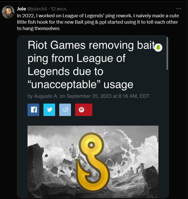 💬 «В 2022 году я работала над системой пинга в League of Legends. Я наивно сделала милый крючок, и люди начали использовать его как оскорбление, намекая, чтобы игроки повесились», – joiechii.
