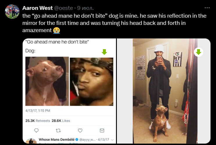 💬 «Собака из мема «Не бойся, он не кусается» моя. Он впервые увидел свое отражение в зеркале и крутил головой с восхищением», – oeste.