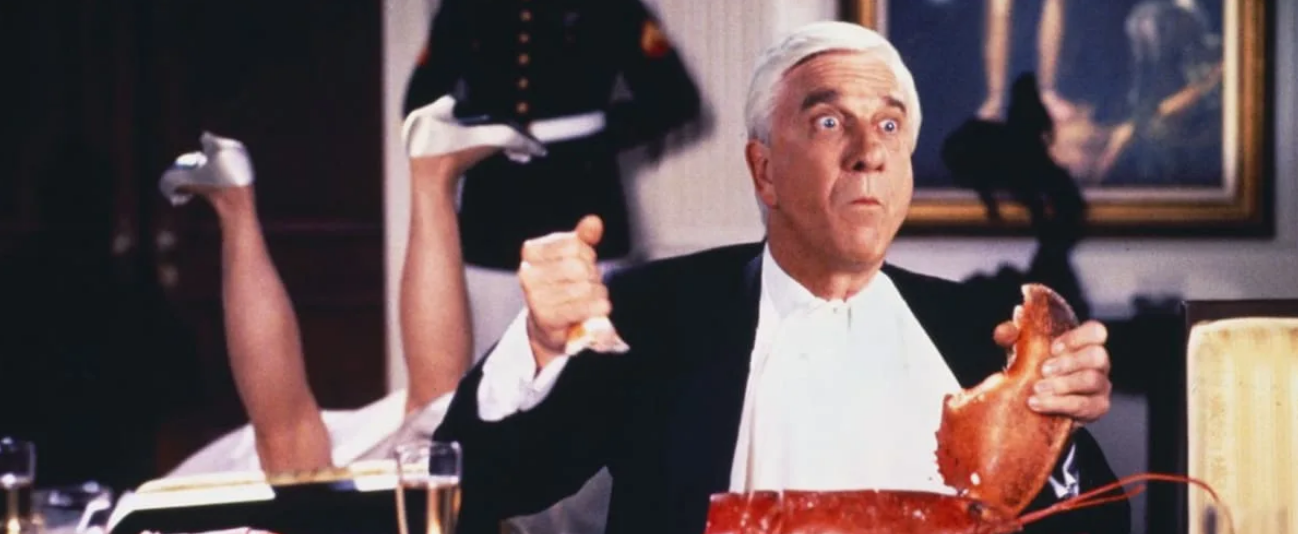 Вмешательство Дребина сопровождается типичным для серии абсурдным юмором, нелепыми ситуациями и неожиданными поворотами, которые держат зрителя в постоянном напряжении и смехе. Фильм мастерски сочетает детективный сюжет с черным юмором и пародийными элементами – от проникновения Фрэнка под видом заключенного в тюрьму до безумной погони за террористами и спасения любимой жены.