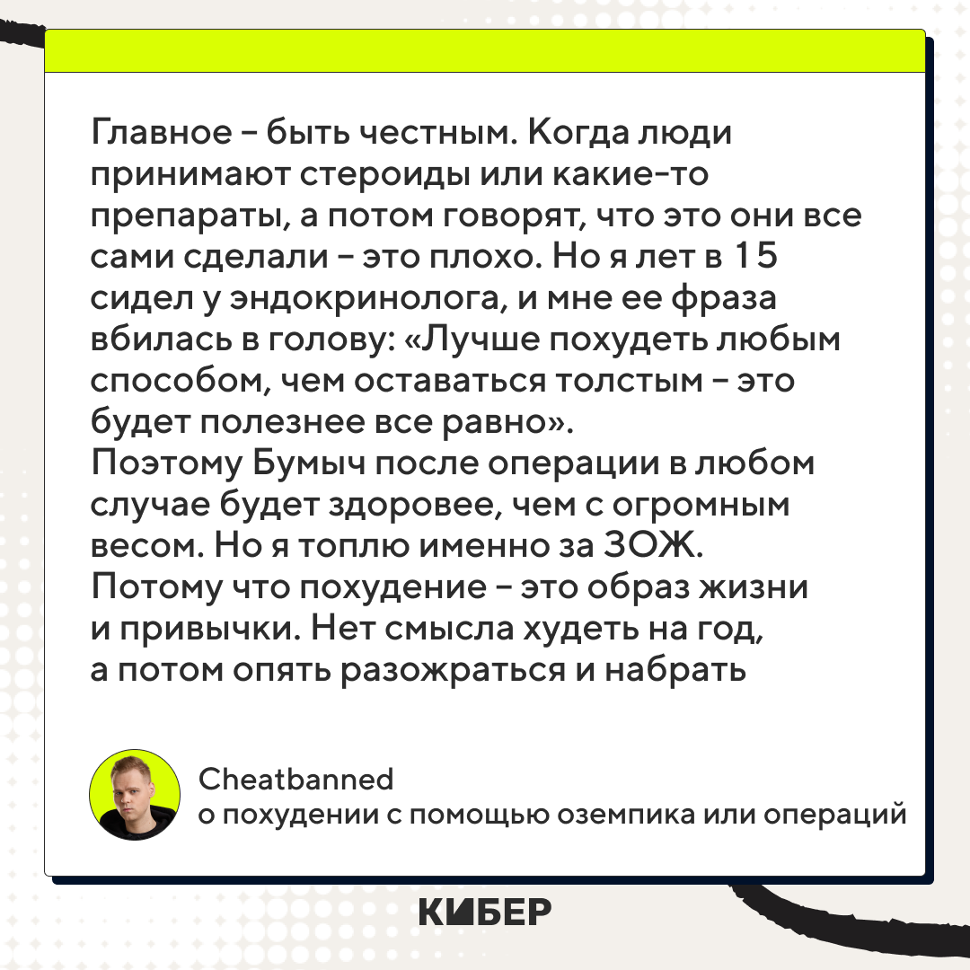 – Главное – быть честным. Когда люди принимают стероиды или какие-то препараты, а потом говорят, что они все сами сделали – это плохо. Но я лет в 15 сидел у эндокринолога, и мне ее фраза вбилась в голову: «Лучше похудеть любым способом, чем оставаться толстым – это будет полезнее все равно». Поэтому Бумыч после операции в любом случае будет здоровее, чем с огромным весом. Но я топлю именно за ЗОЖ. Потому что похудение – это образ жизни и привычки. Нет смысла худеть на год, а потом опять разожраться и набрать. Надо начинать с головы и нового образа жизни – тогда уже никакие таблетки или операции не потребуются.